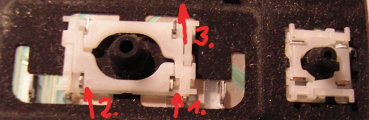 Wie zu sehen, muss man hier behutsam alle Tasten aus ihren Verankerungen herauslösen. Dabei sollte man sehr vorsichtig sein. Denn wie auf den Fotos zu sehen ist, sind die Plastiknasen nicht besonders groß und daher können sie auch schnell abbrechen.