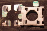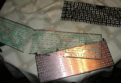 Nachdem alle Tastenkappen gelöst sind, entfernt man ebenso behutsam die kleine Mechanik. Es sind schon sehr interessante Bauteile. Unter der Mechanik befindet sich eine Gummimatte mit den Betätigungs"gnubbeln". Die eigentliche Tastaturmatrix besteht aus drei Folien, wobei die Obere und die Untere mit Leiterbahnen und Kontakten bedruckt sind. Die mittlere Folie dient hier anscheinend als Abstandshalter, damit die Kontakte der einzelnen Tasten im Ruhezustand keinen Kontakt haben.
