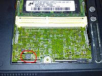 Beim Betrachten der ausgebauten Hauptplatine stellen wir dann fest, dass der Hauptspeicher noch steckte. Und siehe da, unter dem äußeren Steckplatz fand sich dann ein 14 beiniges Etwas mit dem Aufdruck ATMEL 24RF06.